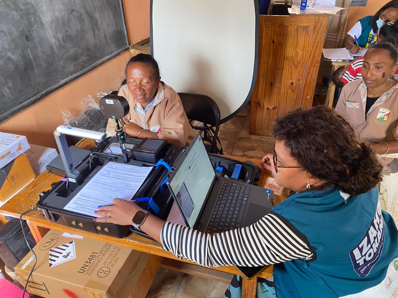 Each kit captures fingerprints, a facial image, and both irises, giving every enrolment a strong, accurate record. Built-in batteries, power banks, and solar panels keep the kits running through long days, even in places with little or no electricity. Weatherproof cases and smart heat control means the equipment works anywhere, from humid coastal towns to high villages on the central plateau.